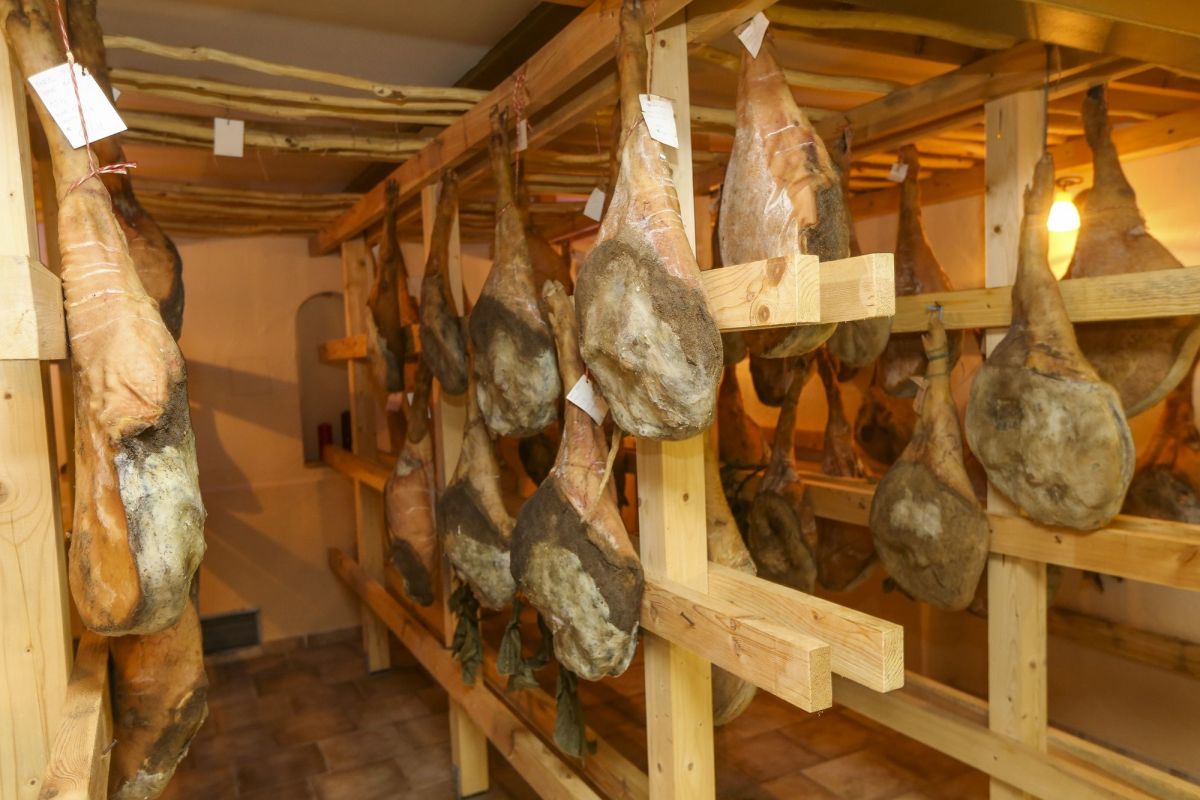 Ob vstopu v klet obiskovalcu sicer še prej kot vino padejo v oči mogočni pršuti, ki visijo v sušilnici nasproti stopnišča. Dva kraška kmeta za Špacapana redita navadne in krškopoljske prašiče. Hranjeni so z zelenjavo, če je zmanjka, dobijo ječmen, pove Špacapan in ponosno izpostavi pršut 350-kilogramskega prašiča. »Ta mora zoreti od štiri do pet let, v povprečju pa so pršuti, ki jih ponudim gostu, stari od tri leta naprej.« V jedilnici sta postavljena dva pršuta, eden domačega prašiče in drugi jelenov, ki ju ekipa Špacapanove hiše pridno reže in streže gostom.