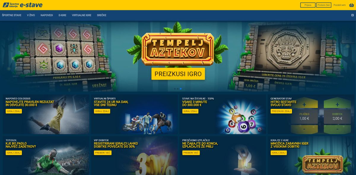 Spletna stran www.e-stave.com je ena najbolj obiskanih spletnih strani v Sloveniji. Uporabnikom ponuja zabavo v svetu iger na srečo s svojo široko ponudbo športnih stav, e-iger, napovednih iger, srečk in virtualnih športov. Prenovljena v barvah, ki sledijo celostni grafični podobi Športne loterije in zavezanosti slovenskemu športu, uporabnikom ponuja boljšo uporabniško izkušnjo.