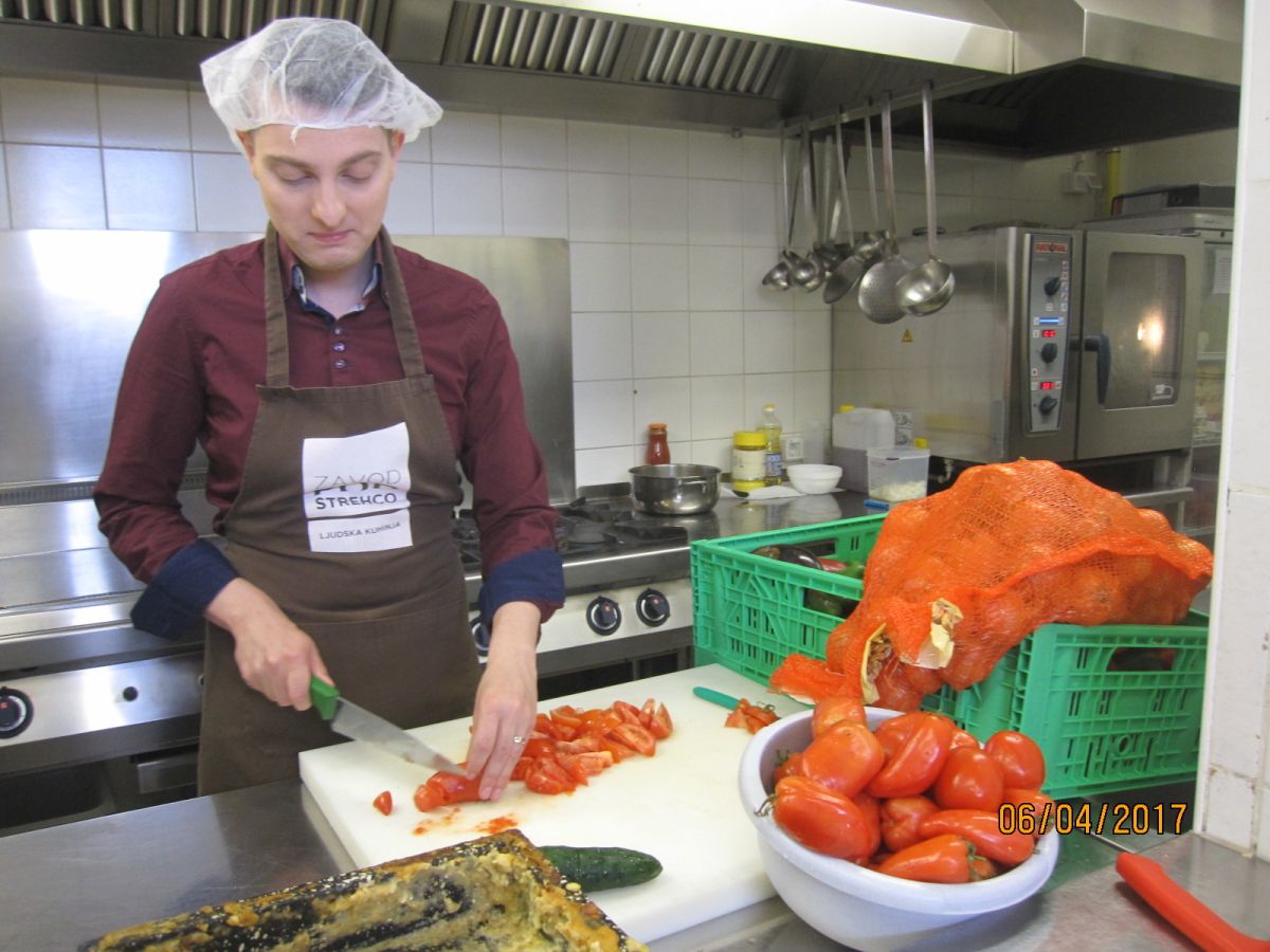 Danes je bil na vrsti Damjan Murko. Samooklicani štajerski slavček je v ljudski kuhinji dan preživel s prostovoljci zavoda in med drugim pridno sekljal zelenjavo (in se še igral s paradižnikom), stregel kosilo in kavico, pa še posodo je pomagal prati na koncu. Ni bil ravno hiter, a namen je bil dober.