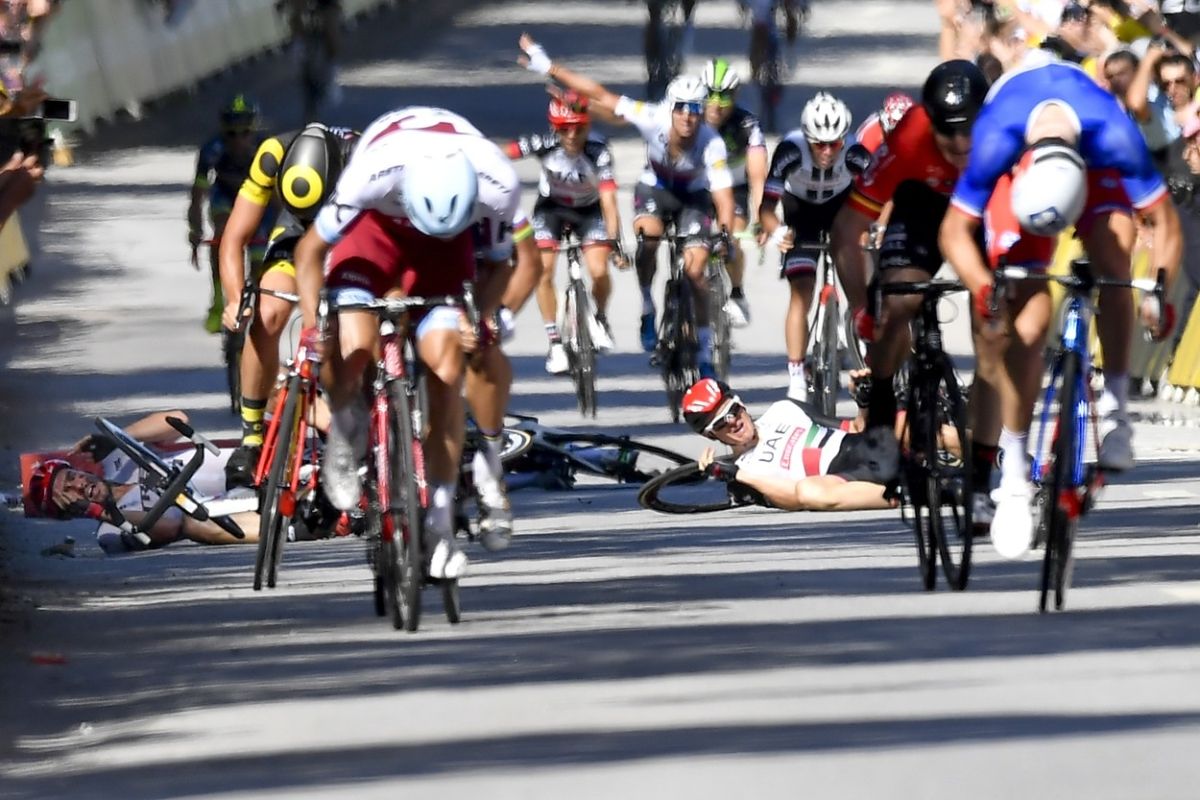 Grd padec se je zgodil v zaključnem sprintu, ko je v boju za položaj ob ogradi Sagan s komolcem zadel v Britanca Marka Cavendisha, ki je zletel v ograjo in se raztreščil po tleh, čez njega pa je s kolesom zapeljal Nemec John Degenkolb, zatem pa še eden od kolesarjev UAE Emirates.
