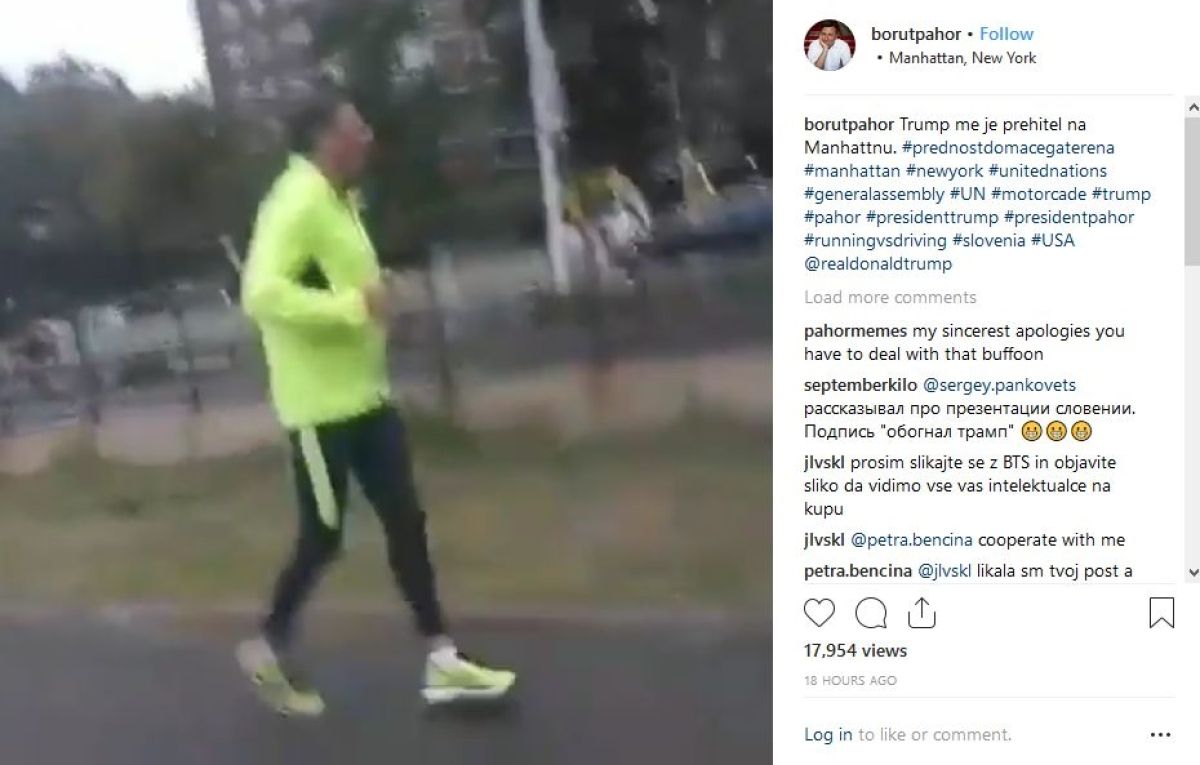"Trump me je prehitel na Manhattnu," je na svojem Instagramu zapisal predsednik države Borut Pahor in objavil video svojega teka po Manhattnu, med katerim se je mimo zapeljala kolona z limuzino ameriškega predsednika.
