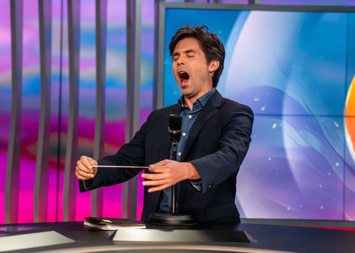 Kadarkoli je gost v studiu Tilen Artač, je vedno zabavno in drugače. Tako je bilo tudi tokrat. Prišel je z dirigentsko paličico, s katero je ves čas mahal po zraku. Ko jo je dobila v roke Žana, je bila presenečena, kako lahka je. Tilen pravi, da je njegova predstava namenjena gledalcem vseh starosti.