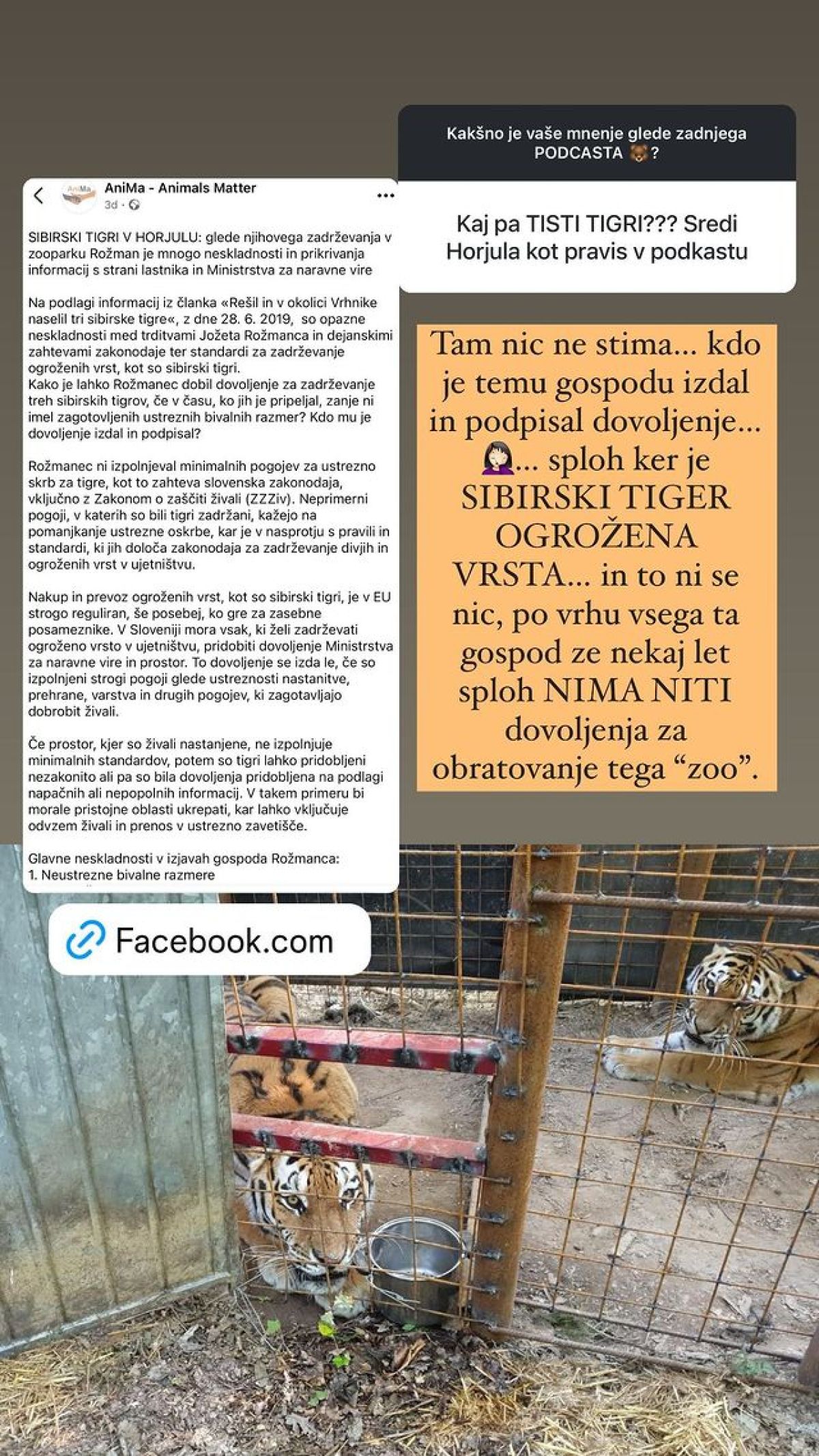 Na piko je vzela še zasebni živalski vrt Rožman v Horjulu, kjer so med drugim razstavljeni sibirski tigri. »Tam nič ne štima … kdo je temu gospodu dal in podpisal dovoljenje,« sprašuje.