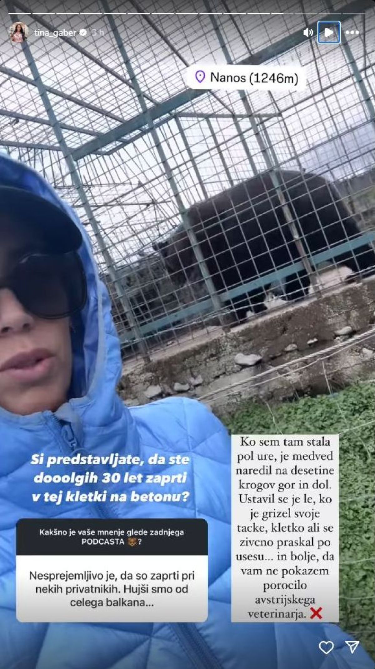 Gabrova je obiskala Turistično kmetija Abram na Nanosu, ki ima v svoji ponudbi v kletki zaprtega medveda Mitka. »Si predstavljate, da ste dooolgih 30 let zaprti v tej kletki na betonu,« je zapisala ob posnetku živali za rešetkami.