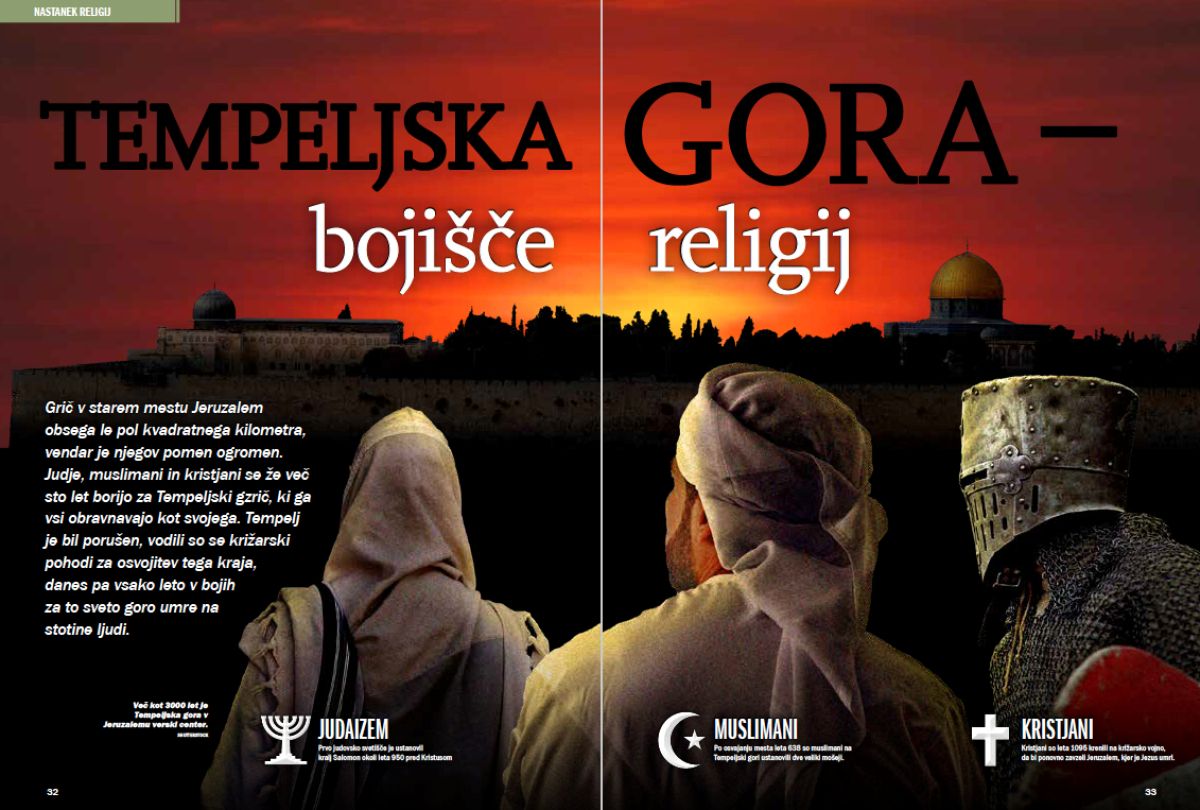 • Tempeljska gora v Jeruzalemu, svetišče za vse tri religije, ostaja srčika mnogih konfliktov. Judaizem, krščanstvo in islam, tri monoteistične vere, so se rodile prav na tem prostoru. Skozi stoletja so bile pogosto povezane z upanjem, a tudi z nasilnimi spopadi.