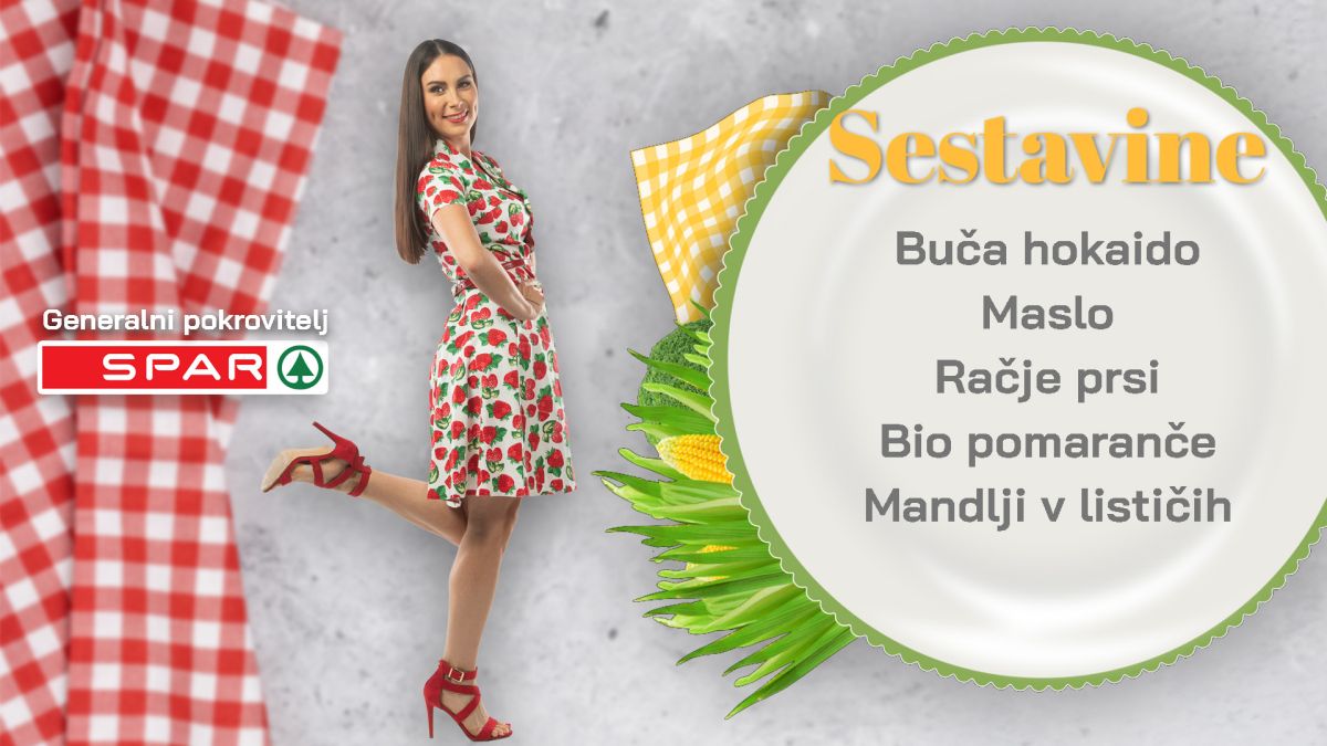 Prinesla mu je bučo hokaido, račje prsi, mandlje v lističih, maslo in bio pomaranče. Tomaž se zelo rad ukvarja s francosko kuhinjo, zato so mu bile sestavine všeč. Izvedeli smo nekaj trikov za pripravo račjih prsi, pred peko jih je treba malo narezati, in v te reže dati začimbe. Pa dati jih je treba peč v mrzlo ponev, da bodo spustila več maščobe in dobila hrustljavo skorjico.