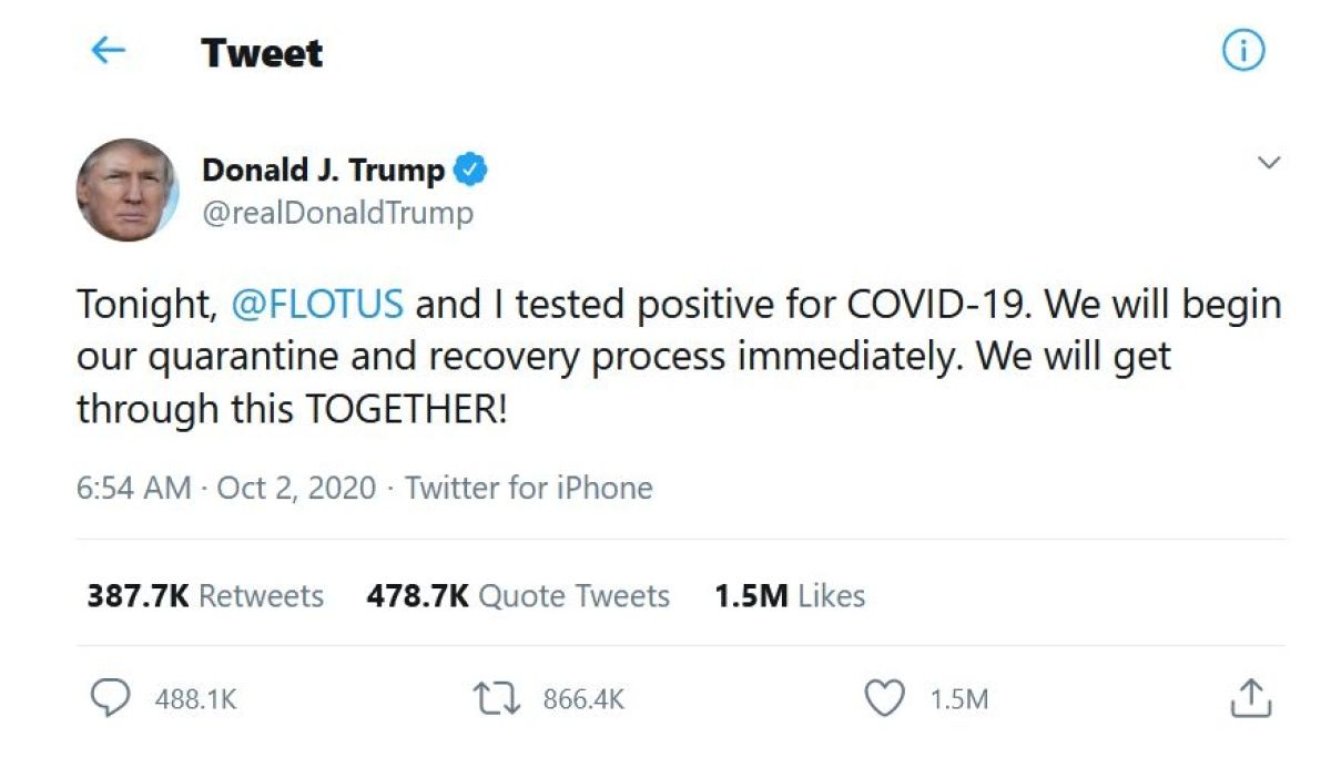 Trumpov tvit, da imata z Melanio koronavirus, je njegov najbolj priljubljen tvit doslej