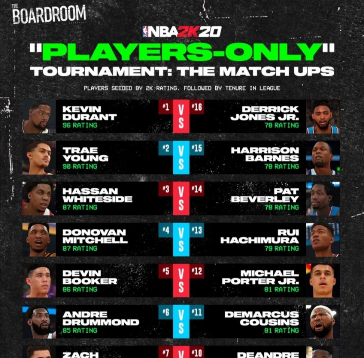 Na spletnem turnirju v igranju virtualne košarka na igralni konzoli XBox One bodo poleg Kevina Duranta (Brooklyn Nets) in Donovana Mitchella (Utah Jazz), oba sta med igralci lige NBA, okuženimi z virusom, nastopili še Trae Young (Atlanta), Andre Drummond (Cleveland), Devin Booker (Phoenix), Hassan Whiteside (Portland), Zach LaVine (Chicago), Montrezl Harrell (LA Clippers), Domantas Sabonis (Pacers), Deandre Ayton (Phoenix), DeMarcus Cousins (brez kluba), Michael Porter Jr. (Denver), Rui Hachimura (Washington), Patrick Beverley (LA Clippers), Harrison Barnes (Sacramento) in Derrick Jones Jr. (Miami).