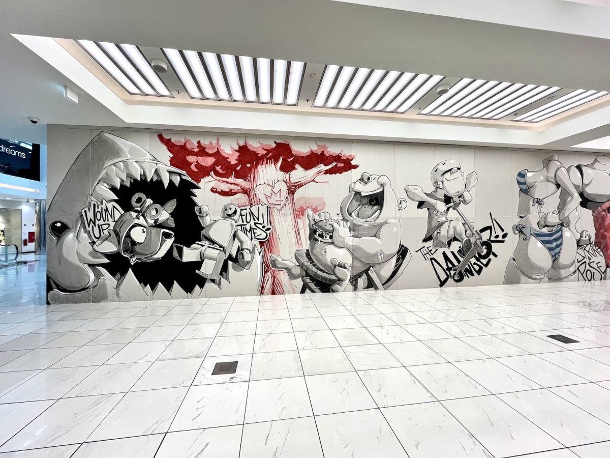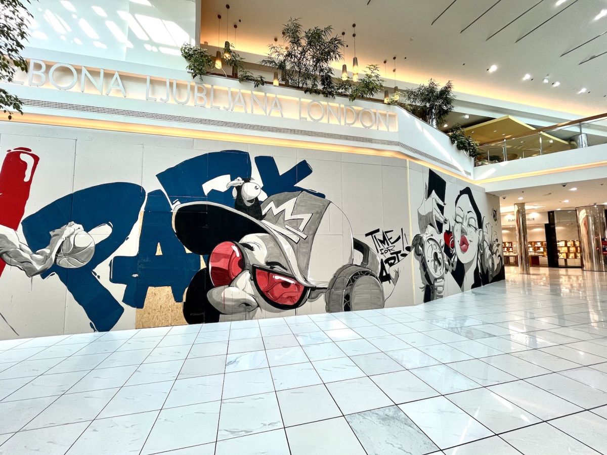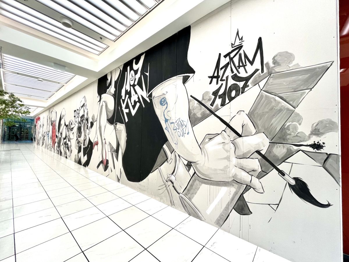 Nakupovalna ulica naše največje nakupovalne destinacije se je spremenila v pravo urbano galerijo. Obiskovalci so lahko v živo več kot mesec dni spremljali nastajanje ulične umetnosti ljubljanskega grafiterja AZRAMA.