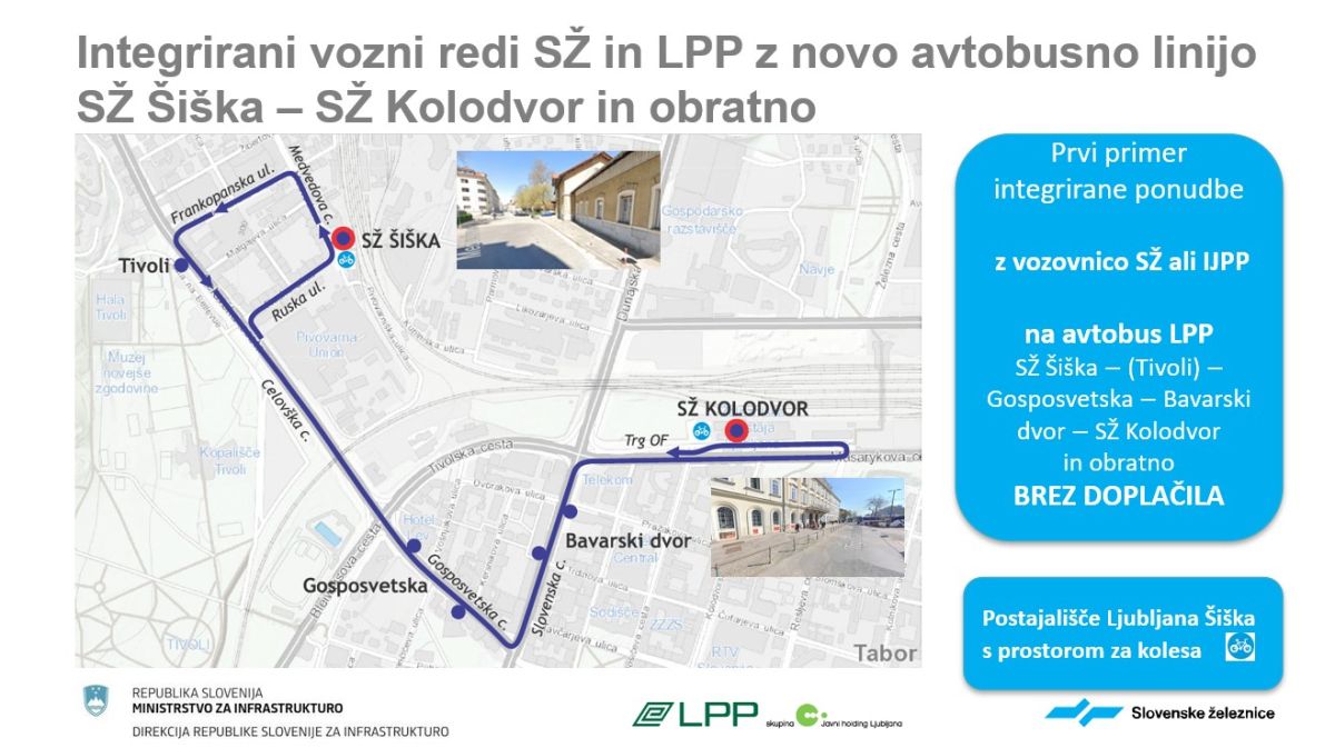 Vsi vlaki do/s postaje Ljubljana Šiška bodo imeli povezavo do/s postaje Ljubljana, z novo LPP avtobusno linijo: SŽ Šiška – SŽ Kolodvor. Linija bo imela tudi vmesne postanke na postajah Tivoli, Gosposvetska in Bavarski dvor in bo tako nudila dodatno možno povezljivost z mestom. S tem bomo dobili prvi primer integrirane ponudbe, ko bo vozovnica SŽ in vozovnica IJPP veljala za prevoz z avtobusno linijo LPP med postajama SŽ Šiška in SŽ Kolodvor.