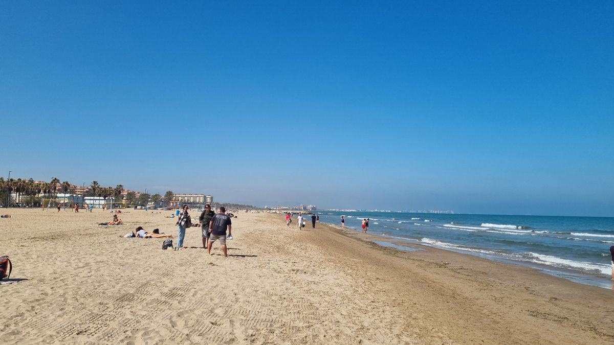 Na koncu smo prišli tudi do morja. Največja javna plaža v Valenciji je več kilometrov dolga in tudi do 100 metrov široka. Posejana je z mikroskopsko drobnim peskom in le predstavljali smo si lahko, kako je videti poleti. Sredi aprila je glede na velikost delovala precej prazno, plavalce pa si zlahka preštel. Zaradi še vedno hladnega morja so oprezno stopicljali vedno globlje, po gležnjih namočili kolena, bedri, nato pa je marsikomu že zmanjkalo poguma. Na koncu plaže je marina, ki pa v tem letnem času še ni bila posebej polna in v njej ni bilo videti prav impresivnih jaht in jadrnic. Poleti, ko se na plažo zgrnejo tako domačini kot turisti, v marini pa svoja plovila zasidrajo milijarderji in zvezdniki, je čisto drugače.