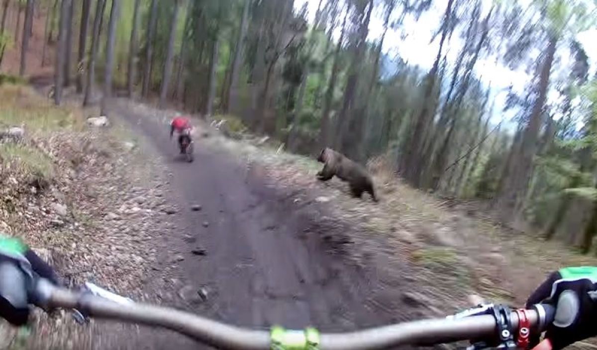 Dušan Vinžík je med vožnjo s kamero na čeladi snemal prijatelja, ki je vozil pred njim. Nenadoma je od strani pritekel medved, ki je začel loviti prijatelja.