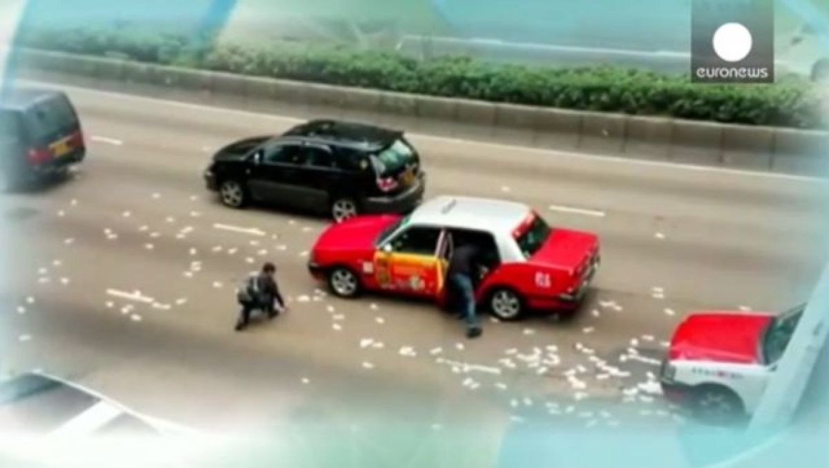 VIDEO: Po prometni nesreči v Hongkongu denar letel po zraku