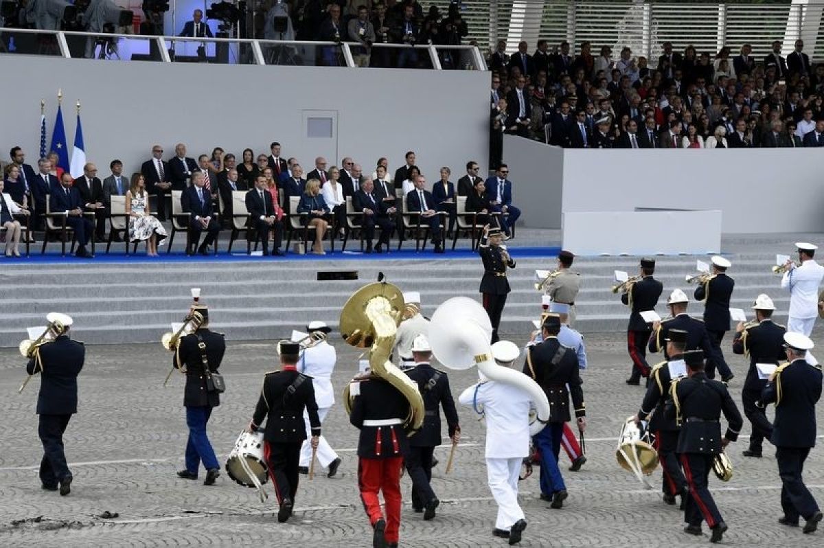 Nenavadna izbira pesmi za zaključek vojaške parade je po poročanju francoske tiskovne agencije AFP očitno zabavala 39-letnega francoskega predsednika Emmanuela Macrona pa tudi njegovo spremstvo, saj so številni ploskali in poplesavali.