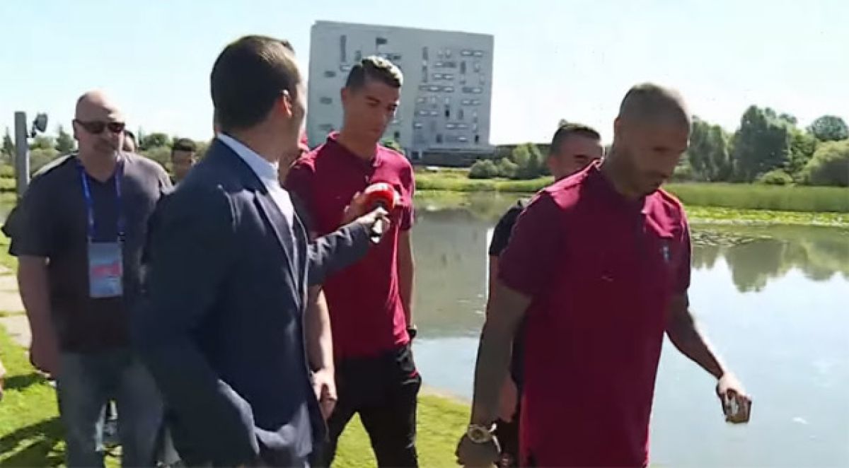 Eden izmed nogometnih superzvezdnikov na evropskem prvenstvu Cristiano Ronaldo, ki se mora braniti očitkov o sila neučinkovitih predstavah, je bil pred tekmo udeležen v dogodek z novinarjem domačega tabloida. Med sprehodom s soigralci iz reprezentance ga je prestregel novinar, Ronaldo je brez besed zagrabil mikrofon in ga zalučal v jezero.