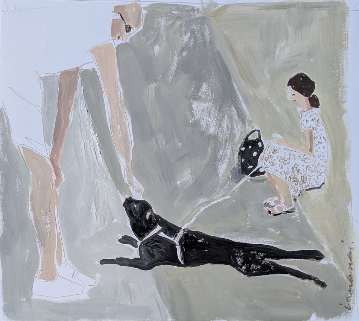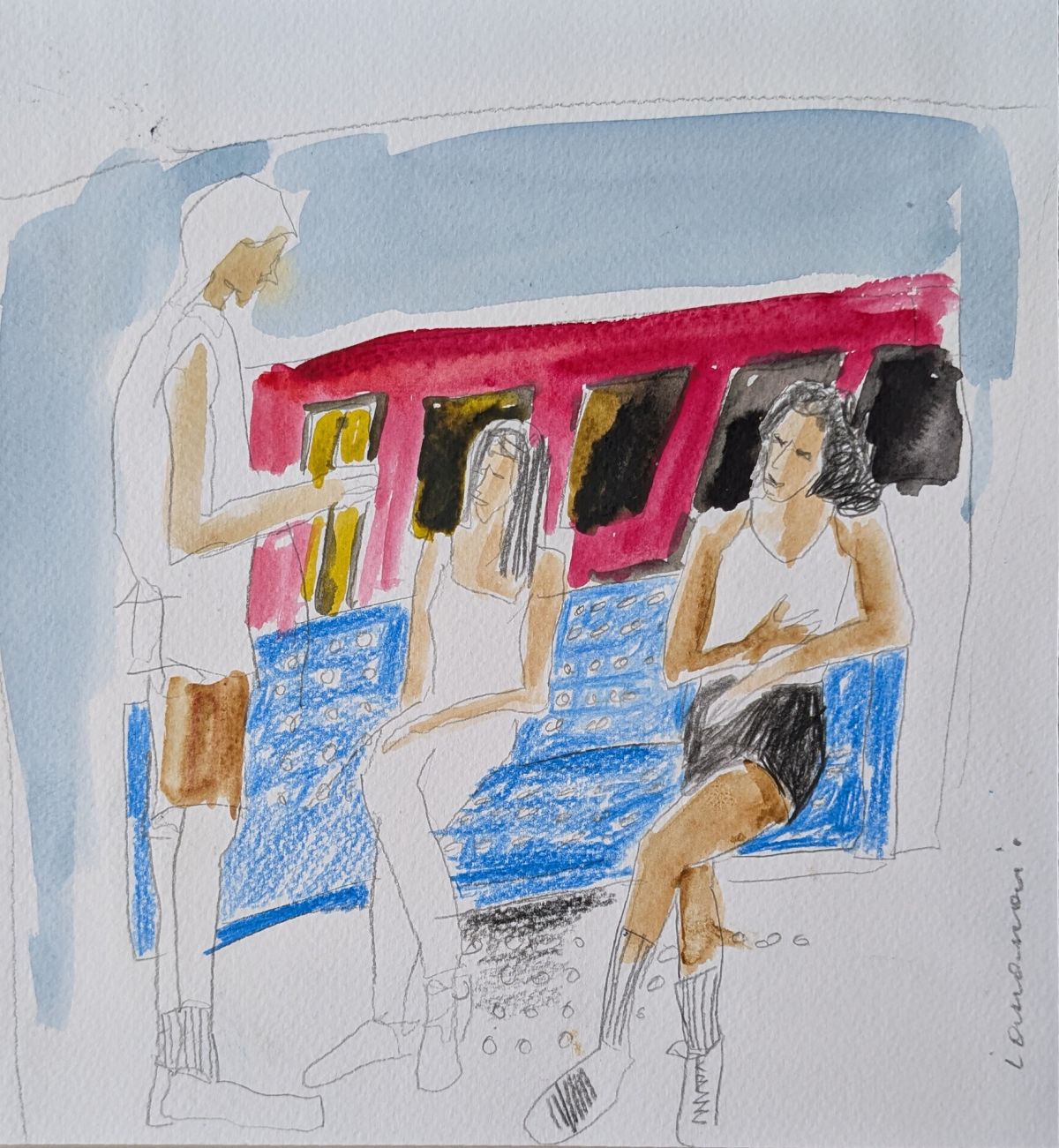 Najprej fotografira trenutek, potem z minimalnimi sredstvi – kemičnimi svinčniki, flomastri, akvareli, tempero in pasteli – ujame hipnost, čustva, razpoloženje. Dela kot Srečanje (2024), Maribor, na železniški postaji (2022) ali Babica (2021) so majhna, a polna zgodb. Kustosinja Živa Kleindienst je prepoznala moč teh skic: umetnost kot nosilka identitete, kot način spopadanja z razseljenostjo.