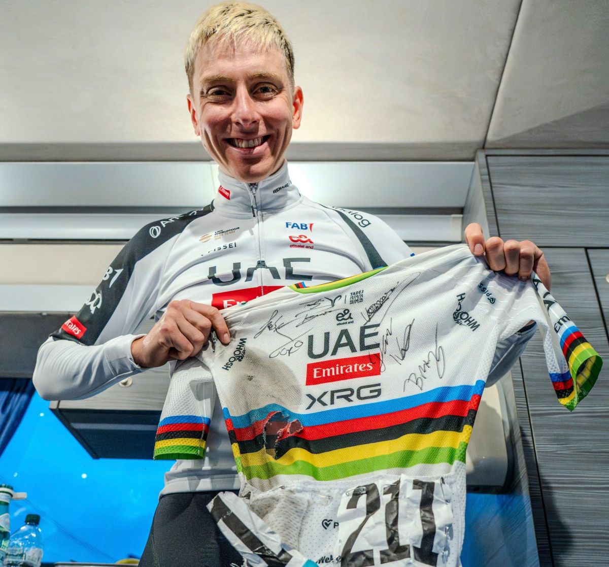 Na letošnjem spomeniku Milano - Sanremo je Pogačar padel 32 km pred ciljem, nadaljeval s poškodovanim kolesom in strganim dresom, a vseeno zmagal. Dres je po zmagi podpisal, prav tako so svoj podpis dodali vsi njegovi sotekmovalci.