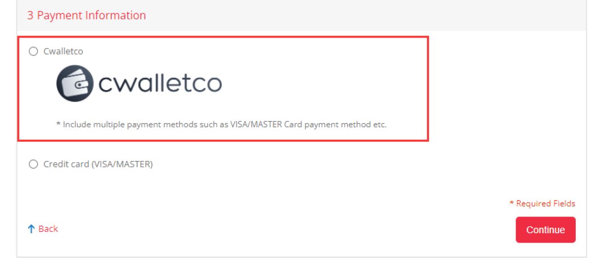2. Po vnosu potrebnih informacij kliknite "cwalletco", da izberete način plačila.