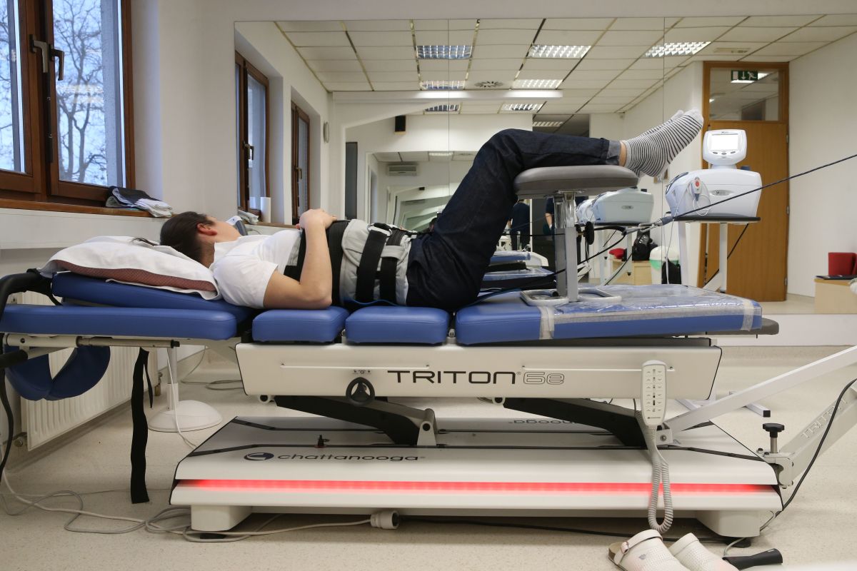 Ko je pregled končan in je zdravljenje določeno, pacienta vzamejo v roke fizioterapevti. Terapija traja eno uro, začne pa se z ogrevanjem tkiva, da se mišice in ligamenti zmehčajo. Prva terapija je še zelo »nežna«, razloži fizioterapevtka Dragana. Raztezanje na ekstenzomatu namreč začnejo z manjšo obremenitvijo, da se pacienti spoznajo z dekompresijsko terapijo in lahko fizioterapevtu povedo, kakšni so občutki in kakšne so morebitne bolečine. Z nadaljnjimi terapijami se obremenitev poveča.