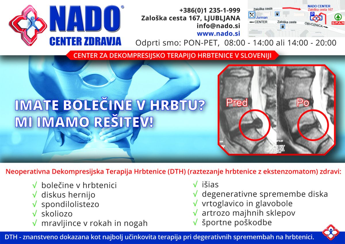 Slovenci s težavami s hrbtom so na terapije z raztegovanjem hrbtenice prej hodili na Hrvaško a že dobro leto lahko to počno doma. V Ljubljani namreč že nekaj časa deluje Nado center, kjer po metodah magistra fizioterapije Bernarda »Nada« Nikšića opravljajo dekompresijsko terapijo hrbtenice.