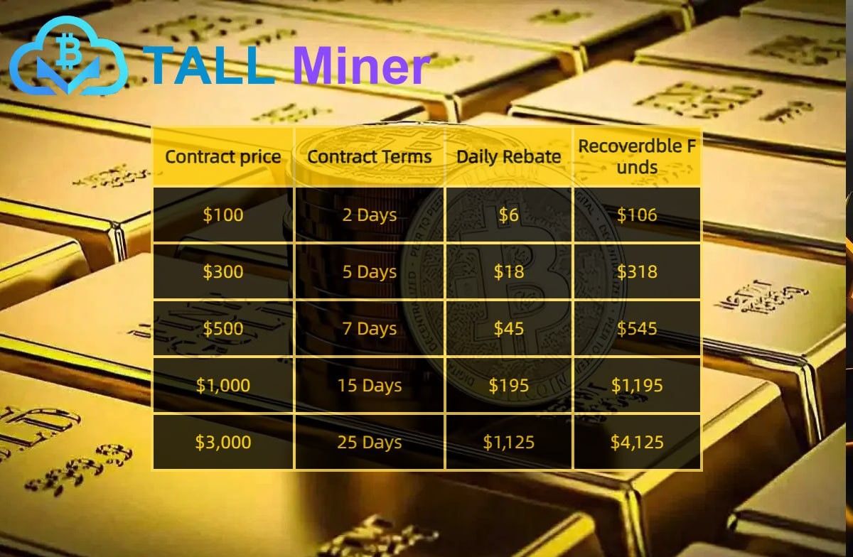 TALL miner to oviro premaga. Prek naše storitve najema računalniške moči v oblaku lahko sodelujete pri rudarjenju digitalnih valut in izkusite nov način upravljanja premoženja – brez nakupa rudarskih strojev, upravljanja strojne opreme ali posebnih tehničnih znanj. Pridružite se TALL miner-ju in enostavno vstopite v val inovacij globalnega digitalnega gospodarstva ter začnite svojo pot povečevanja vrednosti digitalnih sredstev.