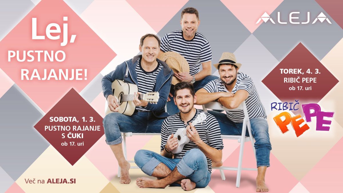 V ponedeljek, 3. marca, ob 17. uri bodo ALEJO obiskali kurenti, ki bodo s svojim glasnim zvonjenjem odganjali zimo in pričarali pravo pustno vzdušje. Pustno dogajanje bomo zaključili v torek, 4. marca, ob 17. uri, ko jih bo obiskal legendarni Ribič Pepe. Otroci bodo lahko uživali v njegovi zabavni pustolovščini.