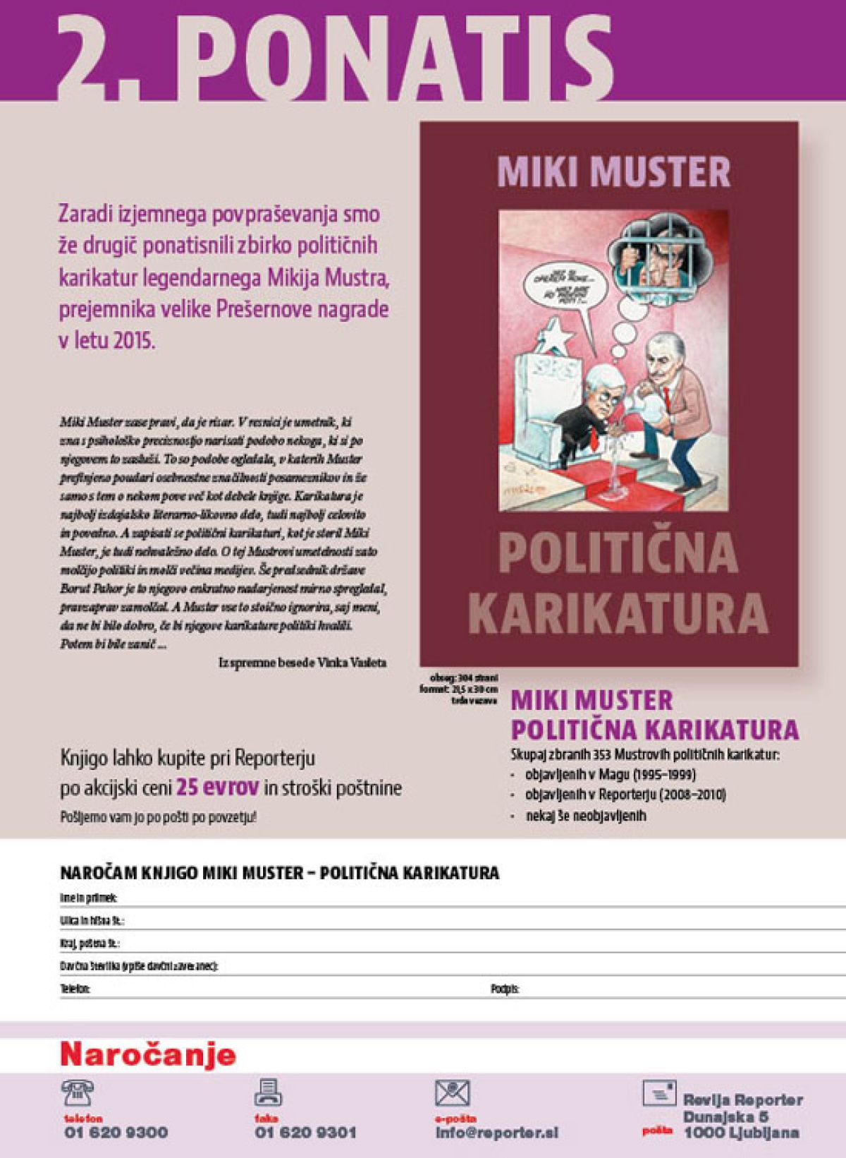 Uspešnica Politična karikatura slavnega karikaturista Mikija Mustra je znova v prodaji. Zaradi izjemnega povpraševanja smo že drugič ponatisnili zbirko političnih karikatur legendarnega Mikija Mustra, prejemnika velike Prešernove nagrade v letu 2015. Skupaj je zbranih 353 Mustrovih političnih karikatur, ki so bile objavljene že v Magu (1995–1999), v Reporterju (2008–2010), nekaj pa je tudi novih in še neobjavljenih.