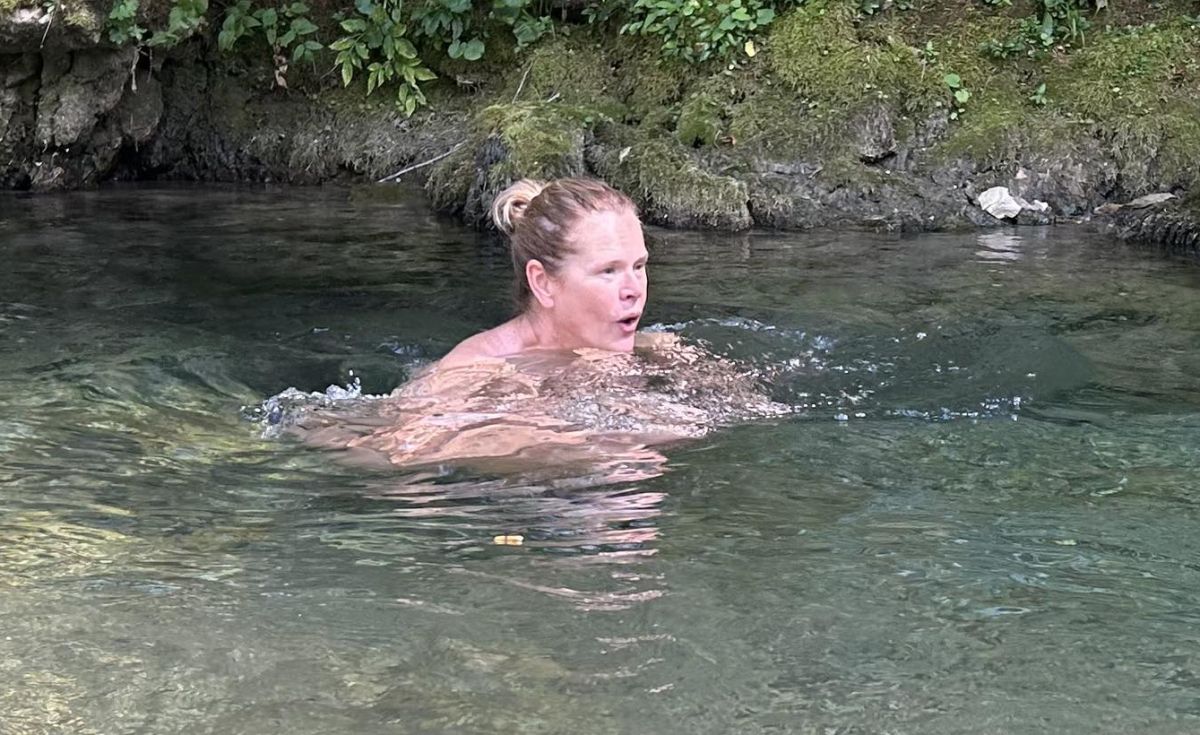 »Po kolesarjenju še prijetna ohladitev v Kokri, ki nima niti 15 stopinj,« je ministrica zapisala na družbenih omrežjih in objavila fotografijo čofotanja v reki.