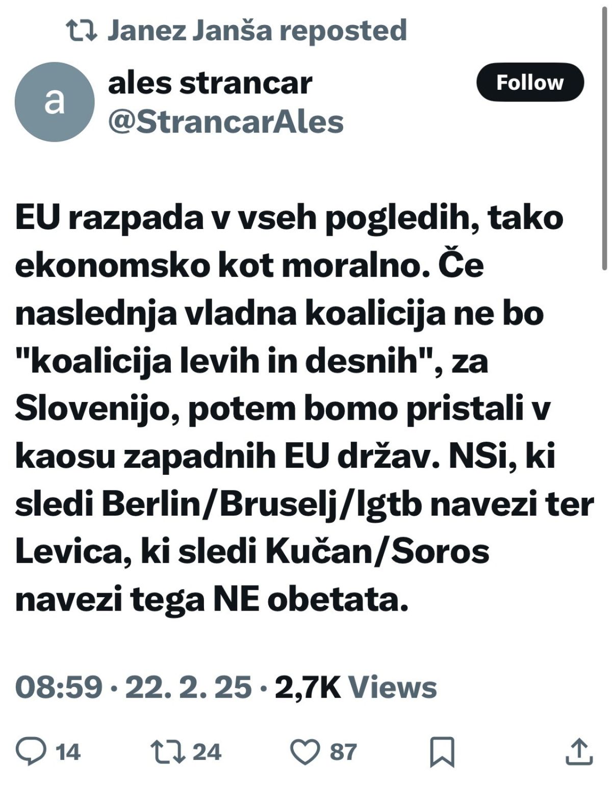 »EU razpada v vseh pogledih, tako ekonomsko kot moralno. Če naslednja vladna koalicija ne bo "koalicija levih in desnih", za Slovenijo, potem bomo pristali v kaosu zapadnih EU držav. NSi, ki sledi Berlin/Bruselj/lgtb navezi ter Levica, ki sledi Kučan/Soros navezi tega NE obetata,« je zapisal 22. februarja, njegov zapis pa je delil tudi prvak SDS Janez Janša.