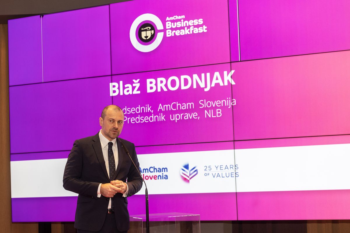 Uvodni pozdrav in pogled na izzive in priložnosti v letu 2024 je z udeleženci delil tudi Blaž Brodnjak, predsednik AmCham Slovenija in predsednik uprave NLB. Poudaril je, da smo geografsko srce Evrope in most med vsemi kulturami in razvojnimi paradigmami: “Danes, ko smo priče izgubi moralnega kompasa in globalni krizi, je čas za določene refleksije, vprašanja, kako preseči to polarizacijo, kako postaviti razmere, ko se bomo lahko o trajnostnem razvoju sploh pogovarjali. Dokler nimamo miru, se težko pogovarjamo o čem drugem. Vendar pa je v Sloveniji prisotna neka energija, dogaja se nek prelom generacij, verjamem pa, da bomo uspeli uspešno nasloviti izzive. Naj bo leto 2024 leto ponovne vzpostavitve ponovnega miru …”