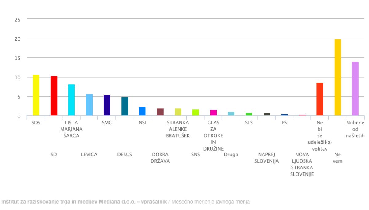 Med strankami so na prvih treh mestih SDS (10,6 odstotka), SD (10,3 odstotka) in Lista Marjana Šarca z 8,1-odstotno podporo.