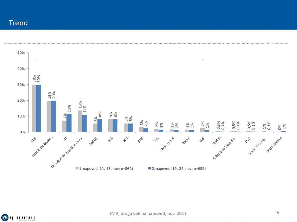 Javnomnenjska raziskava Episcentra je SDS-u namerila 30 odstotkov na volitvah 4. decembra. Druga je Pozitivna Slovenija, ki je v anketi dobila 20 odstotkov, SD in Lista Gregorja Viranta pa 11 odstotkov glasov. Anketo je Episcenter opravil med 19. in 24. novembrom, anketirali pa so 689 ljudi.