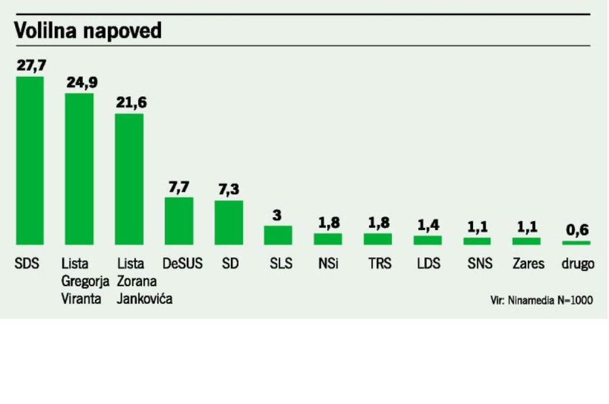 Anketa, ki jo je za POP TV in Dnevnik pripravila agencija Ninamedia, kaže, da bi največ volivcev na državnozborskih volitvah podprlo stranko SDS (27,7 odstotka). Sledita lista Gregorja Viranta (24,9 odstotka) in lista Zorana Jankovića (21,6 odstotka). Za DeSUS bi glasovalo 7,7 odstotka, za SD pa 7,3 odstotka volivcev.