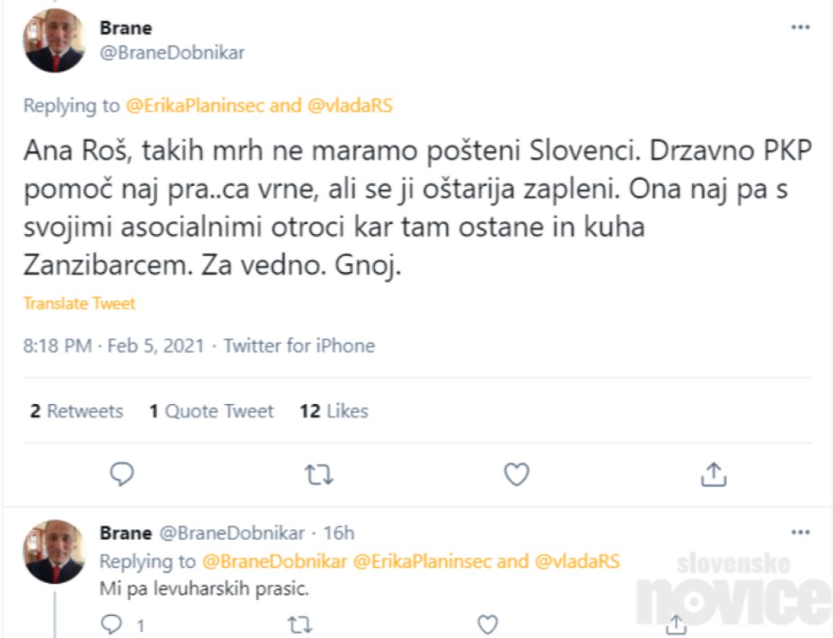 Branko Dobnikar si je dal duška na Twitterju: "Ana Roš, takih mrh ne maramo pošteni Slovenci. Državno PKP pomoč naj pra..ca vrne, ali se ji oštarija zapleni. Ona naj pa s svojimi asocialnimi otroci kar tam ostane in kuha Zanzibarcem. Za vedno. Gnoj." Ano Roš brez dvoma poznate, to je svetovno priznana in znana slovenska kuharica, ki je slovensko kulinariko in Hišo Franko ponesla v svet. Prav tako si je s svojimi stvaritvami prigarala dve Michelinovi zvezdici. Poudarimo, da je že ena zvezdica veliko priznanje za restavracijo in znak, da je lokal na vrhunskem nivoju v vseh pogledih.