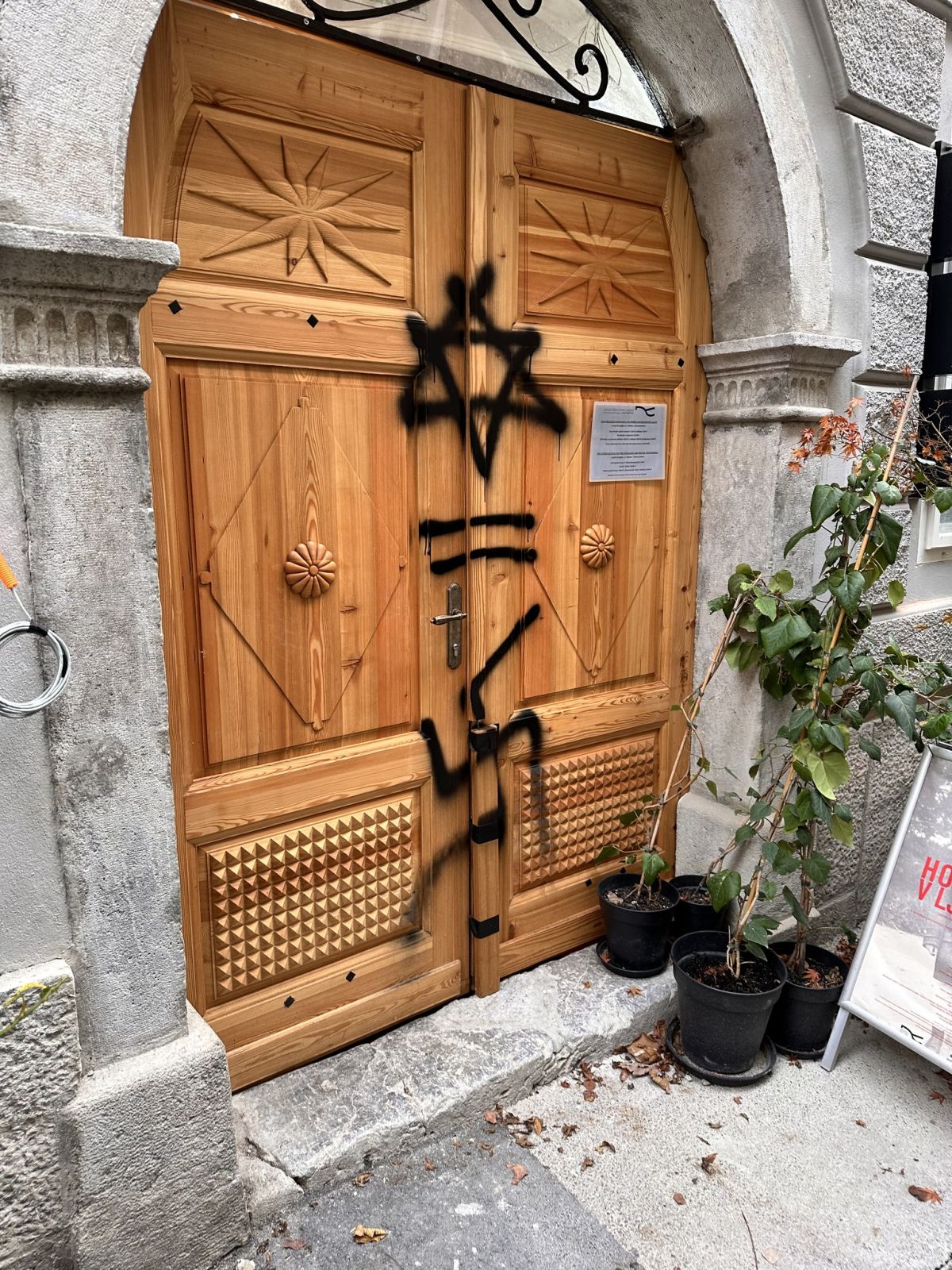 Vandali so se znesli nad vrata Judovskega kulturnega centra na Križevniški, kjer domujejo Muzej holokavsta v Sloveniji, Judovski muzej, Sinagoga in je trenutno na ogled razstava o družini Ane Frank, v hiši pa te dni poteka tudi festival strpnosti. Na vratih je sveže narisan simbol svastike.