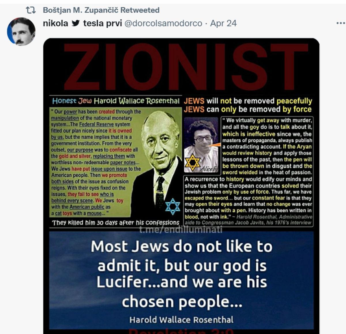 Zmešalo se mu je, nam je na vprašanje, kaj se dogaja z nekdanjim uglednim pravnim strokovnjakom dr. Boštjanom M. Zupančičem (BMZ, rojen leta 1947) odgovoril eden od njegovih znancev. BMZ tudi redno retvita (poobjavlja) protijudovske zapise avtorjev, ki se ne razkrijejo s pravimi imeni, na družbenem omrežju twitter. Med drugim je v zvezi z agresijo Rusije na Ukrajino poobjavil zapis, da »židovska globomafija Zemljane nezaustavljivo peha v jedrsko izničenje«.