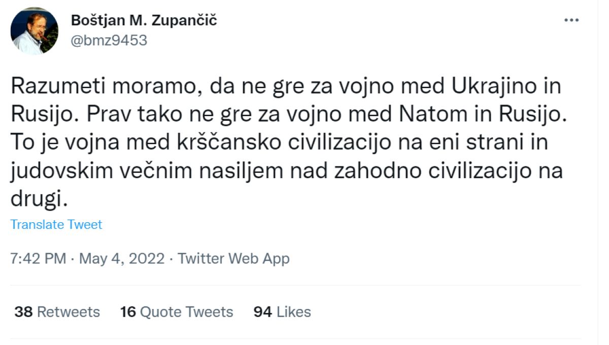 Nekdanji profesor na Pravni fakulteti v Ljubljani in dolgoletni sodnik na Evropskem sodišču za človekove pravice Zupančič na twitterju objavlja, da ne gre za vojno med Ukrajino in Rusijo, niti ne za vojno med Natom in Rusijo. Po njegovem gre za »vojno med krščansko civilizacijo na eni strani in judovskim večnim nasiljem nad zahodno civilizacijo na drugi.«