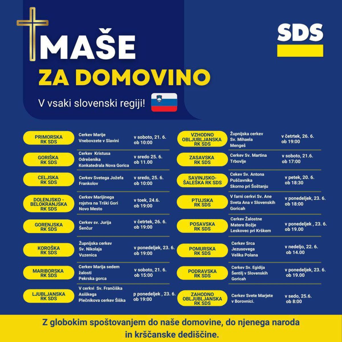 Maše so organizirale regijske koordinacije SDS od Primorske do Prekmurja. Prve bodo že ta konec tedna, zadnje pa 26. junija. »Z globokim spoštovanjem do naše domovine, do njenega naroda in krščanske dediščine,« so v SDS zapisali ob napovedi maš-