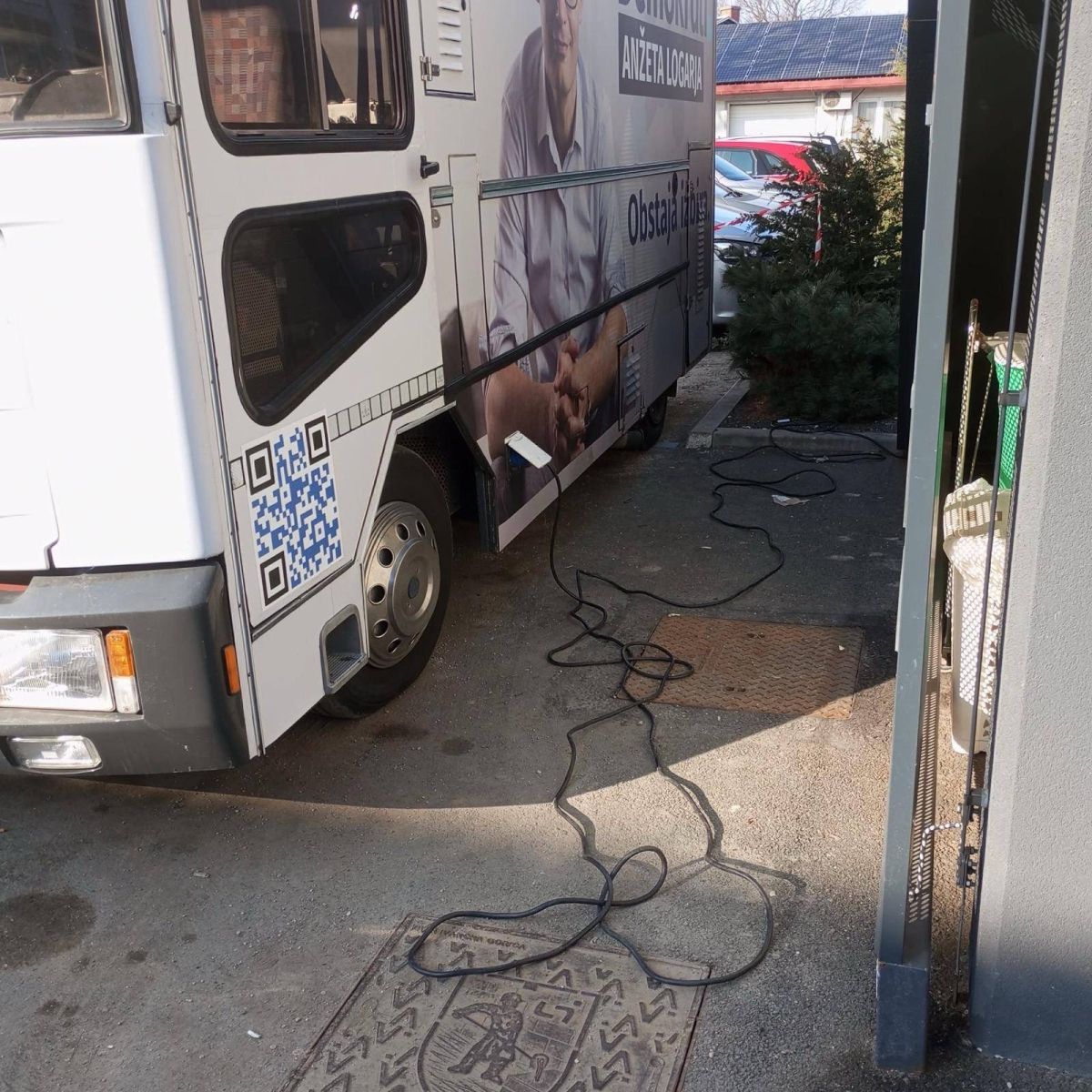 Tovornjak stoji tik ob vhodu v urgenco ZD Ljutomer, za povrh je še priklopljen na elektriko iz zdravstvenega doma.