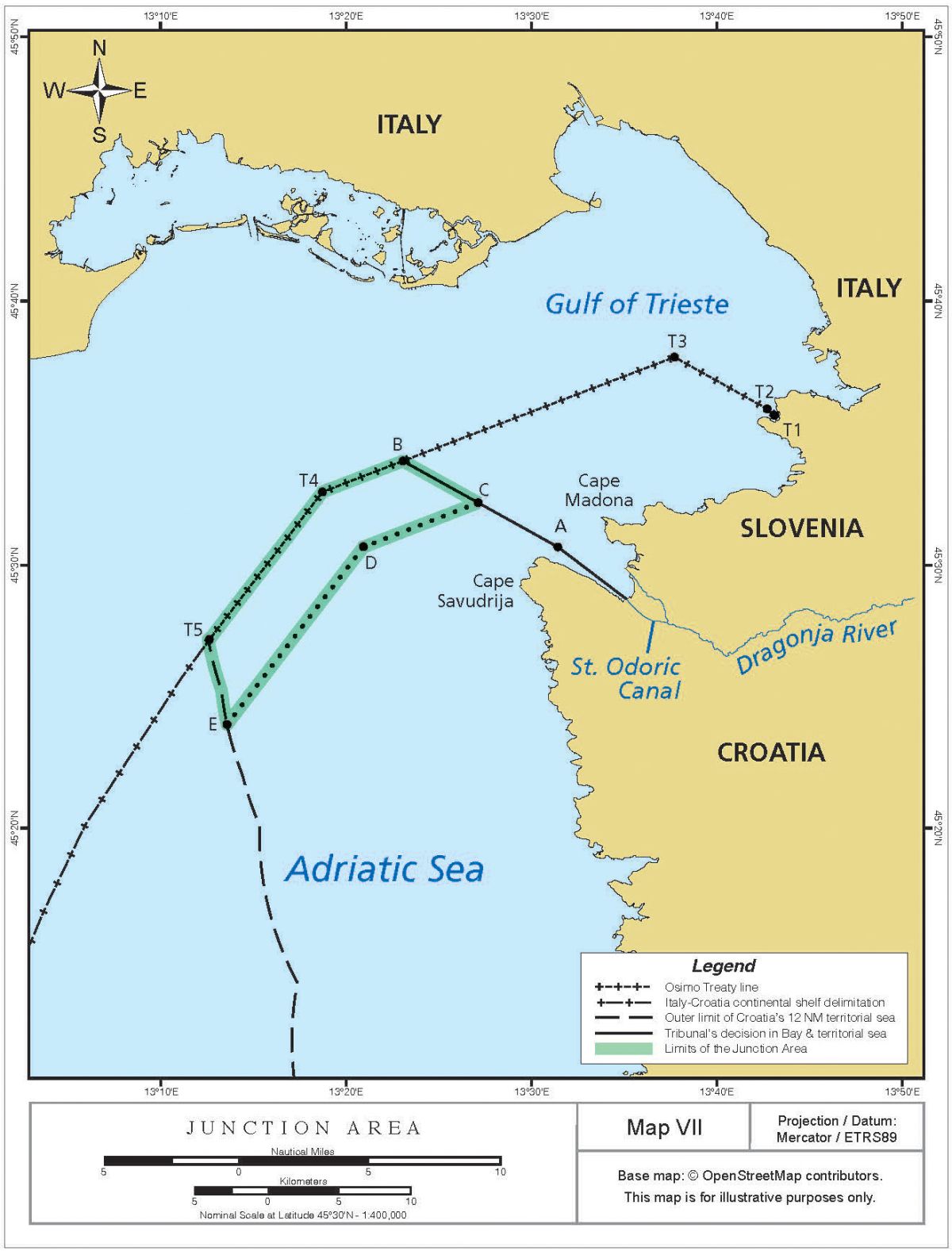 Kot je v ustni predstavitvi sodbe v Haagu dejal predsednik sodišča Gilbert Guillaume, ki je pokazal tudi zemljevid, Sloveniji pripada Piranski zaliv od ustja Dragonje oz. sredine kanala Sv. Odorika do točke 45° 30' 41,7'' severne geografske širine in 13° 31' 25,7'' vzhodne geografske dolžine oz. na treh četrtinah razdalje med rtom Savudrija in piranskim Rtom Madona. Morska meja se nato nadaljuje južneje od črte ekvidistance do osimske meje ter kompenzira ukleščenost slovenske obale.