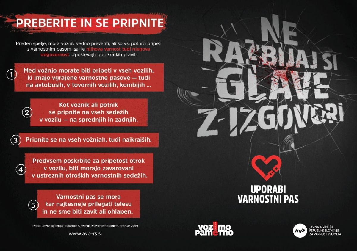 "Uporaba varnostnega pasu je obvezna, ne glede na izgovore. Namesto teh naj voznik in potniki pred vožnjo pomislijo na varnostni pas in se pripnejo na vsaki, tudi najkrajši vožnji in na vseh sedežih. Pripeti se pomeni preživeti," so izpostavili na agenciji, kjer so pripravili tudi novo kreativno kampanjo: Ne razbijaj si glave z izgovori. Uporabi varnostni pas.