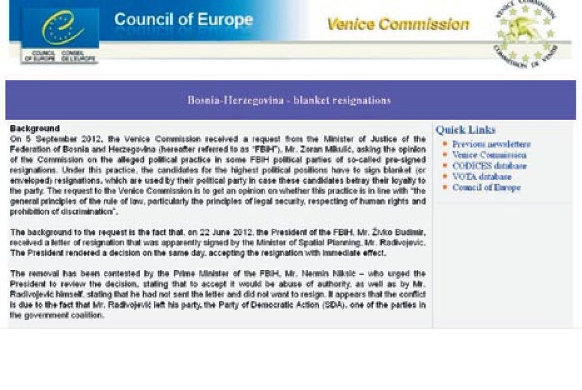 Praksa vnaprej podpisanih izjav, ki jih lahko te stranke uporabijo, če kandidat izda njeno zaupanje, je po mnenju Beneškem komisije, to je komisije Sveta Evrope za demokracijo skozi pravo, vprašljiva in v neskladju z demokratičnimi praksami, h katerim stremi Evropa. Komisijo je namreč nedavno za mnenje o deponiranih odstopnih izjavah poslancev in drugih kandidatov za politične funkcije nekaterih bosansko-hercegovskih strank prosilo pravosodno ministrstvo BiH.