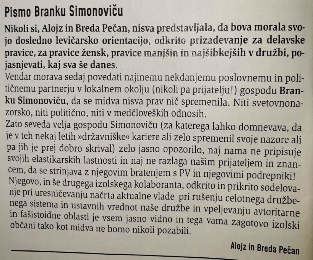 Poslanec SD Marko Koprivc je na svojem facebooku objavil pismo zakoncev Alojza in Brede Pečan, v katerem se javno distancirata od poslanca Desusa Branka Simonoviča, svojega nekdanjega poslovnega in političnega partnerja v Izoli, ki pa ga nikoli nista imela za prijatelja.