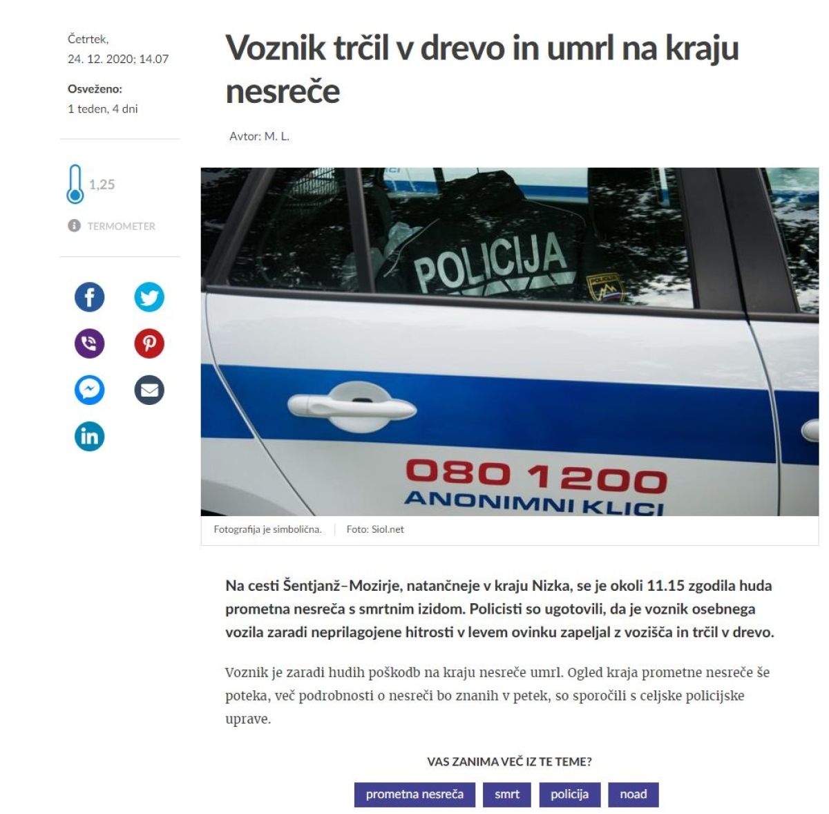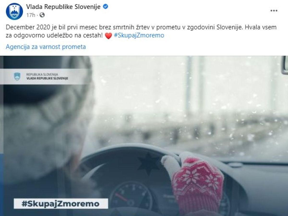 Vlada se je na Facebooku pohvalila, da je bil december 2020 bil prvi mesec brez smrtnih žrtev v prometu v zgodovini Slovenije. A to ne drži – 24. decembra se je v prometni nesreči cesti Šentjanž-Mozirje v kraju Nizka se je okoli 11. ure zgodila prometna nesreča s smrtnim izidom.