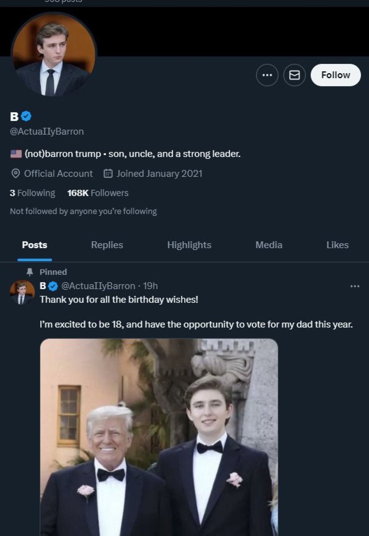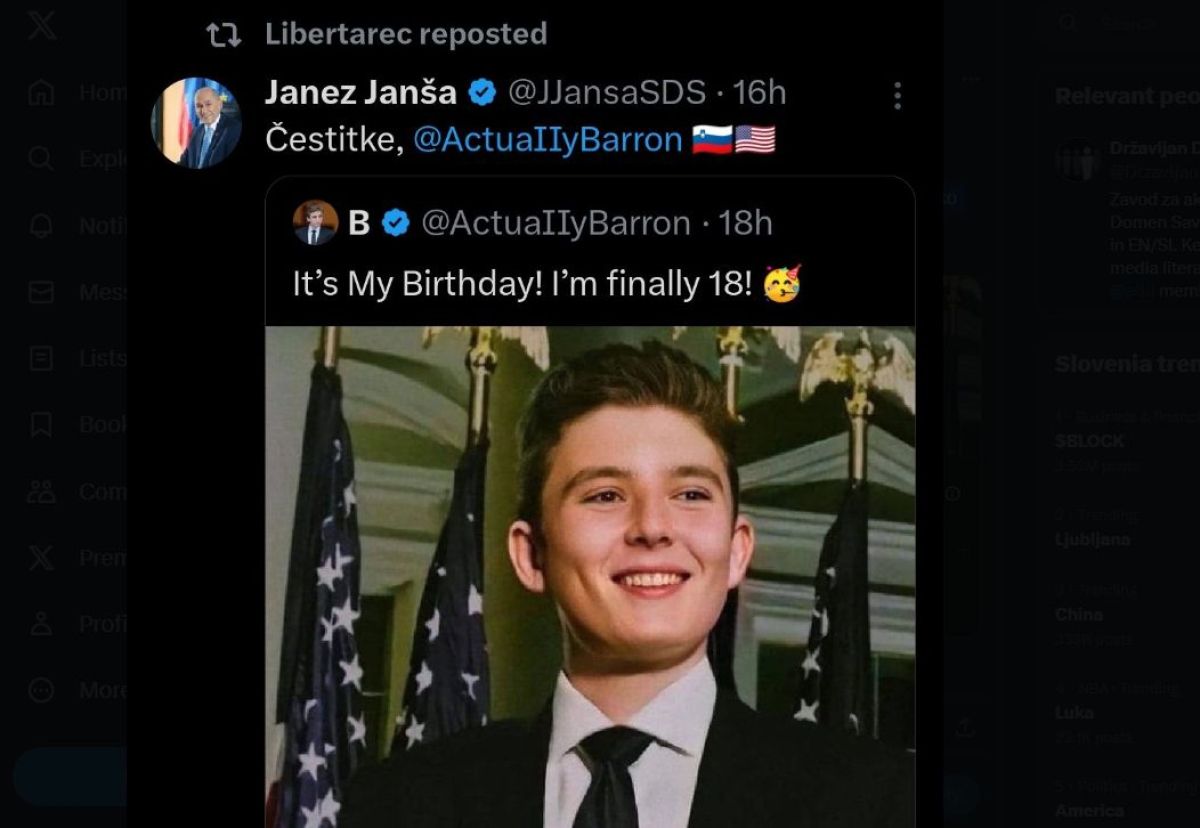 Prvak SDS Janez Janša je na omrežju X voščil vse najboljše Barronu Trumpu, sinu nekdanjega ameriškega predsednika Donalda Trumpa in bivše prve dame ZDA Melanie Trump, ki je dopolnil 18 let. A Janša je svoj tvit naslovil na profil ActuallyBaron, ki pa ne pripada Barronu – najstnik namreč sploh nima profila (ali vsaj ne javno znanega) na omrežju X ali kateremkoli družbenem omrežju.