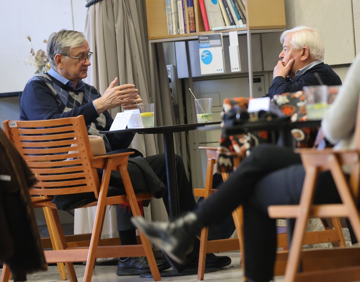 V ljubljanskem baru Idealist v Cankarjevem domu je naš fotograf »ujel« nekdanja predsednika Milana Kučana in Danila Türka, ki sta staknila glavi ob limonadi in, predvidevamo, razpravljala o aktualni družbeno-politični situaciji v državi.