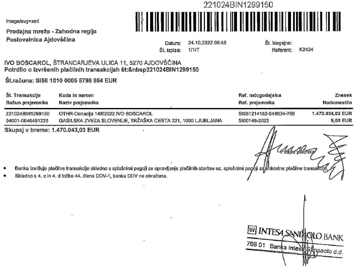 Tako je nastala osnova za donatorsko pogodbo s prejemnico, Gasilsko Zvezo Slovenije, po kateri sem dne 24. 10. 2022 sredstva v višini 1.470.034,03 EUR tudi nakazal in izpolnil svojo dano obljubo.