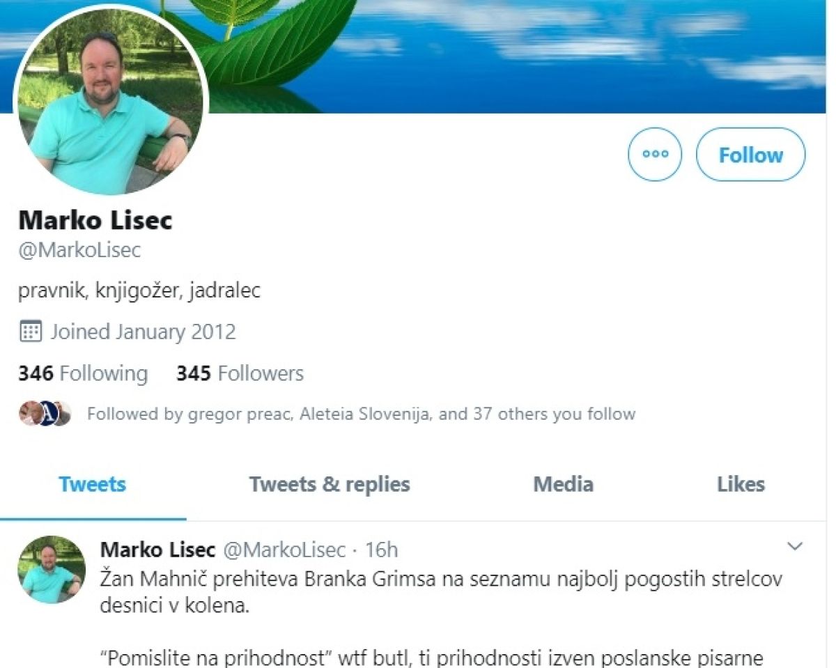 »Žan Mahnič prehiteva Branka Grimsa na seznamu najbolj pogostih strelcev desnici v kolena. “Pomislite na prihodnost” wtf butl, ti prihodnosti izven poslanske pisarne nimaš,« je čivknil Marko Lisec ob izjavah podpredsednika Knovsa Žana Mahniča po parlamentarnemu nadzoru na NPU.