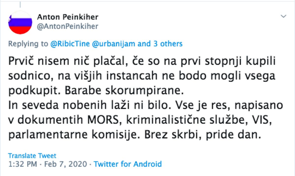 Izvedeli smo, da je Peinkiher po prvostopni sodbi (zanj neugodni) na omrežju twitter celo namigoval, da naj bi »kupili sodnico«, na višjih instancah pa da »ne bodo mogli vsega podkupiti«.