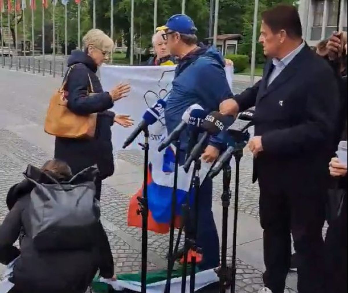 Slišati je vzklike »Za Slovenijo!« in »Briši klošarji!«, medtem ko predstavnica Gibanja za pravice Palestincev poziva medije, naj posnamejo incident.